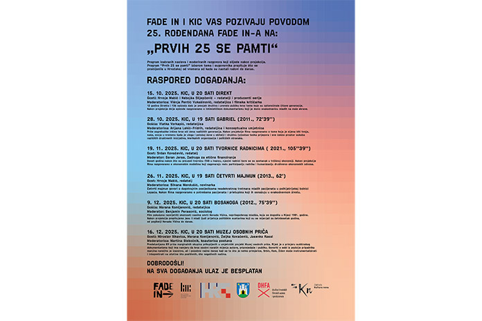 U sklopu projekta “Fade In – prvih 25 se pamti”, Fade In započinje seriju događanja posvećenih stvaralaštvu i autorima koji su obilježili četvrt stoljeća rada u ovoj organizaciji. Kako je riječ o studiju u sklopu koga su radili i afirmirali se brojni hrvatski dokumentaristi (danas) srednje generacije, program je osim uvida u njihov pristup, prilika za kontekstualiziranje društveno relevantnih tema (tada, kada su radovi nastali i danas).