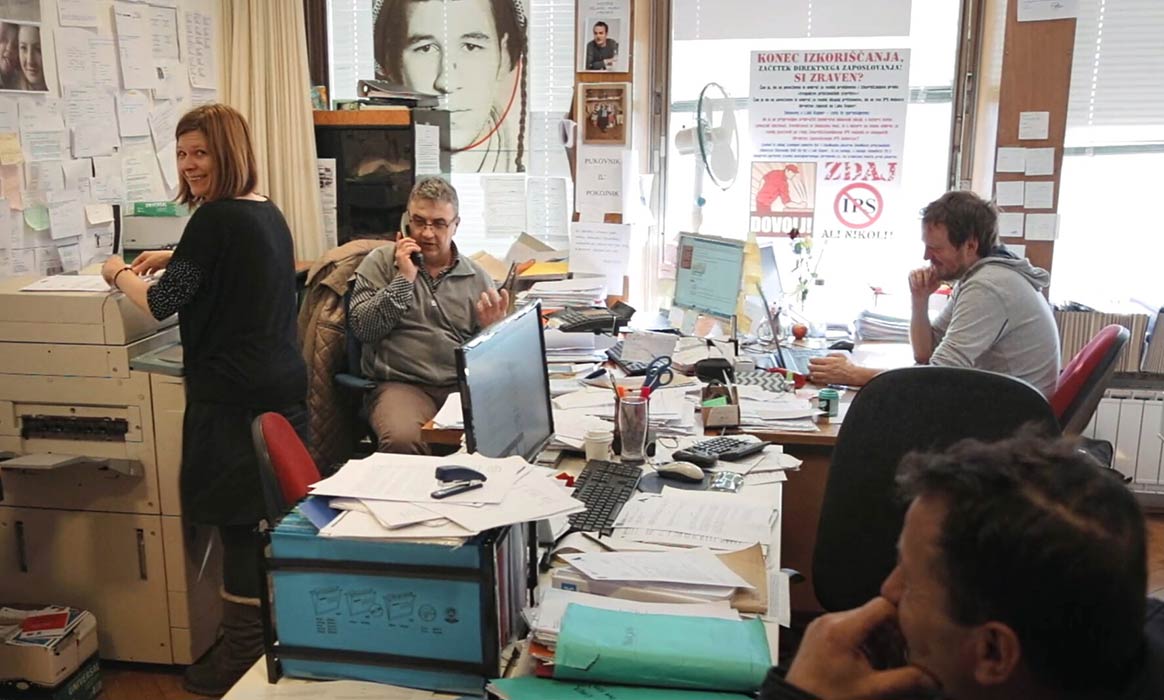Dobar dio dokumentarca snimljen je u malome uredu gdje se stisnulo troje protagonista; ovo nije mjesto opremljeno visokom tehnologijom 21. stoljeća, već se u njemu guraju velika fotokopirka, oblijepljeni panoi i hrpe papira. Ali njegovi zaposlenici se itekako bave suvremenim problemima. Mahom se radi o dikenzijanskim sudbinama eksploatiranih radnika različite dobi i stupnja obrazovanja, navučenih da potpišu nešto što nisu trebali. Svi su oni došli u Sloveniju trbuhom za kruhom jer im je obećana plaća od preko tisuću eura, a zapravo vraćaju dio plaće poslodavcu za izmišljene troškove, koji rade po dvanaest sati dnevno iako su potpisali zakonom propisano radno vrijeme od osam sati. Radnici, koji uglavnom ostaju anonimni, nisu upoznati sa zakonskim pravima i obvezama, a neki ne znaju ni kako se zove firma koja im duguje novac. Troje zaposlenika strpljivo sluša priču svakog ponaosob uživo u uredu ili telefonskim putem i zatim strpljivo pojašnjava korake kojima se radnici mogu izvući iz kafkijanskih problema. Posebno se ističe nastup Gorana Zrnića, bivšeg električara iz Banje Luke, koji vrlo direktno, ali uvijek s dozom humora, umjesto pukog objašnjavanja prava i obveza, radnicima osvještava postojanje ljudskog dostojanstva, koje se slomilo pod teretom ekonomskih okolnosti.